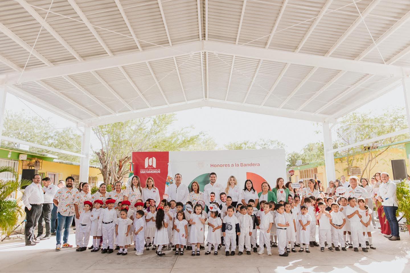 H. Matamoros, Tamaulipas.- El alcalde Beto Granados encabezó la ceremonia de Honores a la Bandera en el Jardín de Niños Estefanía Castañeda, donde además inauguró la nueva techumbre destinada a proteger a la comunidad escolar de las inclemencias del tiempo. La directora del plantel, María Teresa Ruiz, dio la bienvenida al mandatario municipal y expresó un profundo agradecimiento por la obra que, afirmó, representa una mejora significativa para las actividades pedagógicas, físicas y culturales de los alumnos.