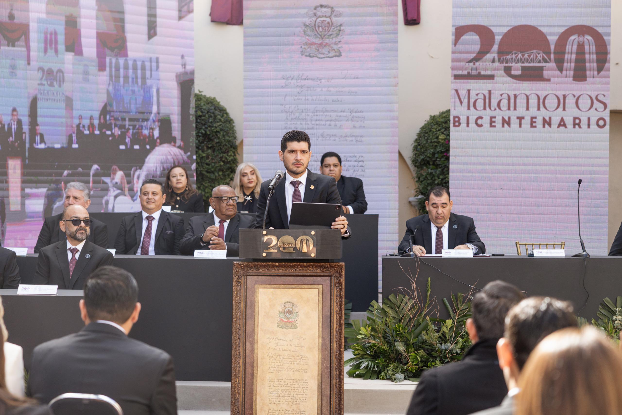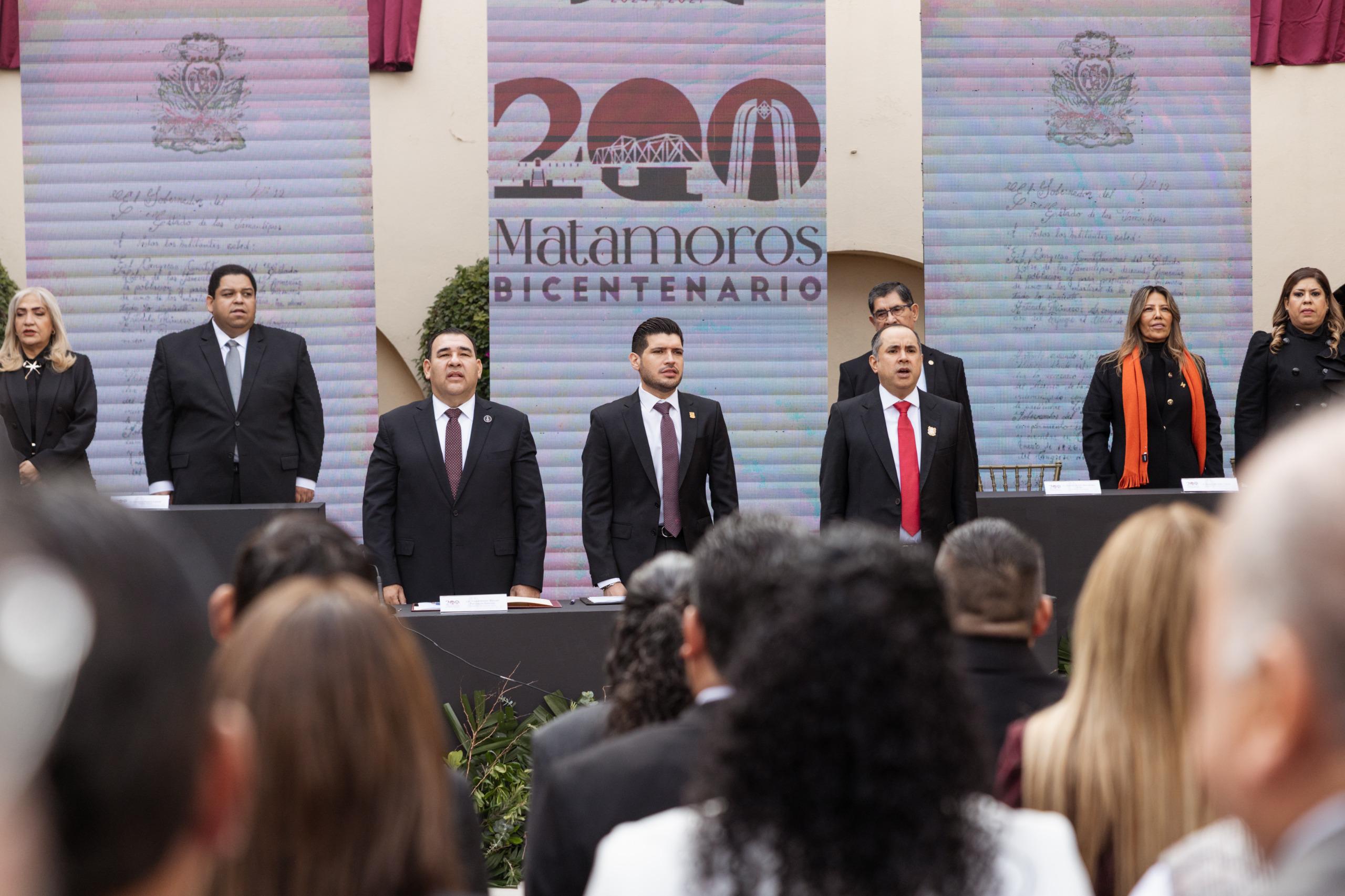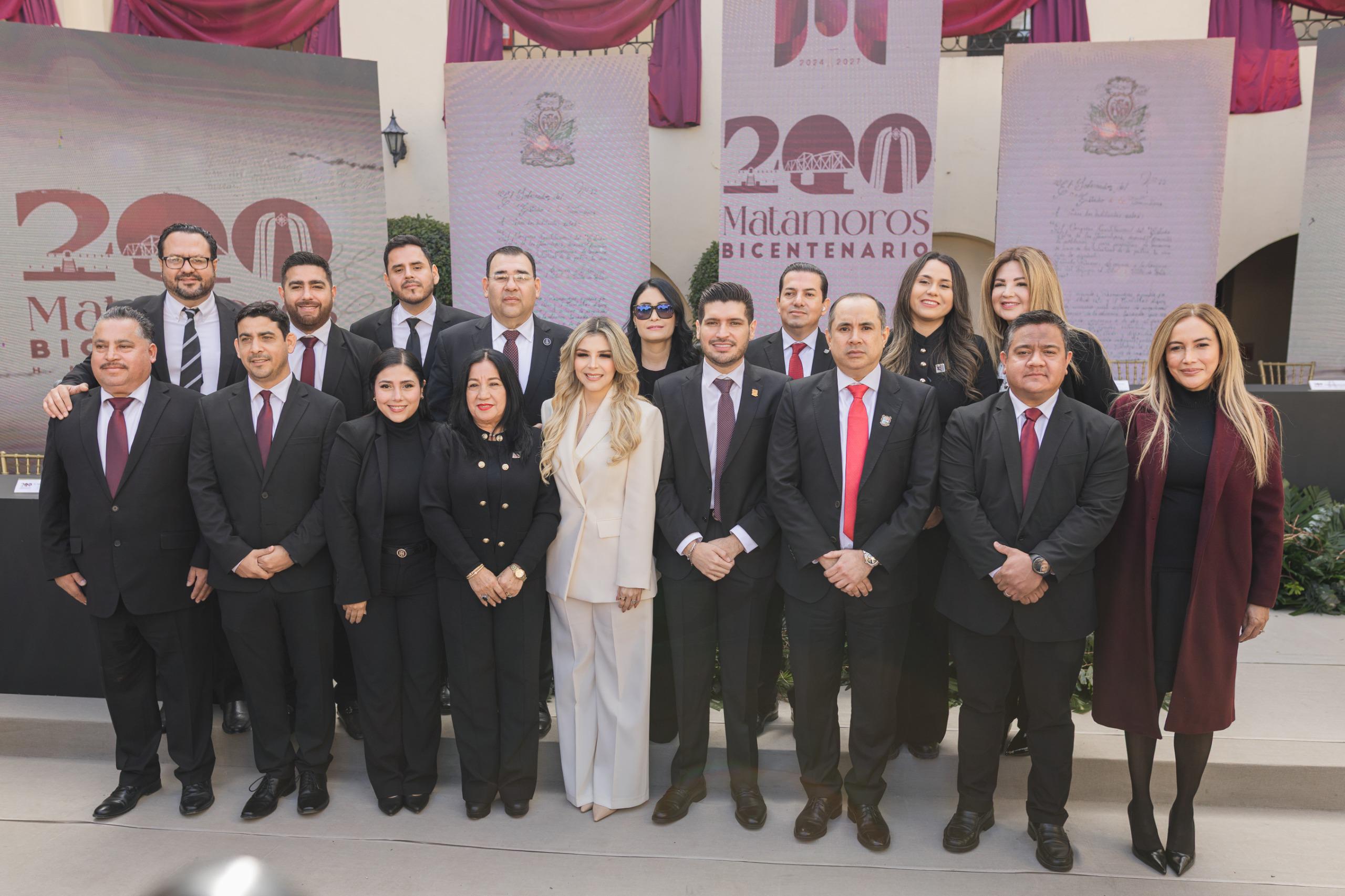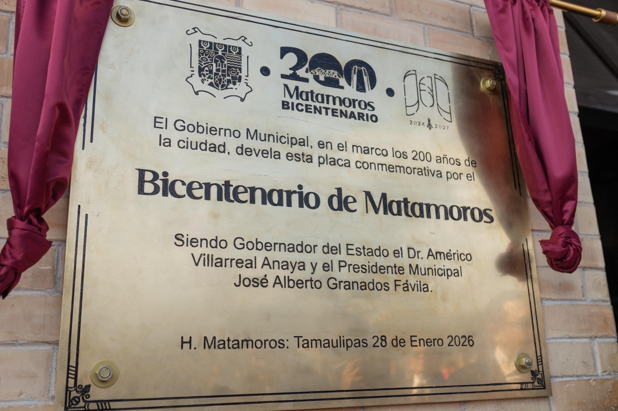 Como parte de los actos conmemorativos, se llevó a cabo la develación de la placa del Bicentenario de Matamoros, la cual quedará instalada en la Presidencia Municipal como un símbolo del trabajo, responsabilidad y esperanza bajo el mandato de el Gobernador del Estado Dr. Américo Villarreal Anaya y el Presidente Municipal Lic. José Alberto Granados Favila.