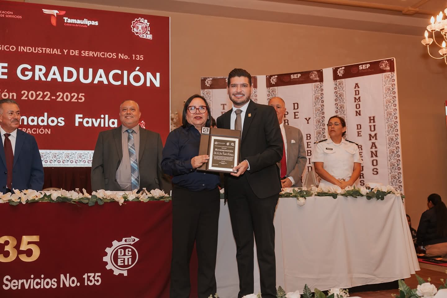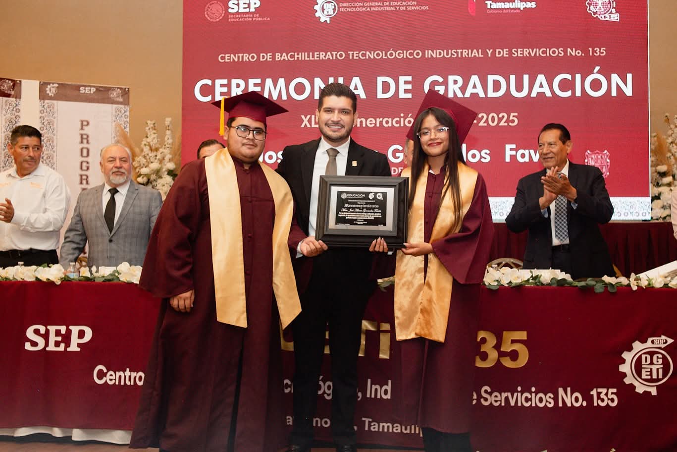 H. Matamoros, Tamaulipas.- El alcalde Beto Granados tuvo el honor de ser padrino de generación de los alumnos del Centro de Bachillerato Tecnológico Industrial y de Servicios No. 135 (CBTis 135), tanto del turno matutino como del vespertino.