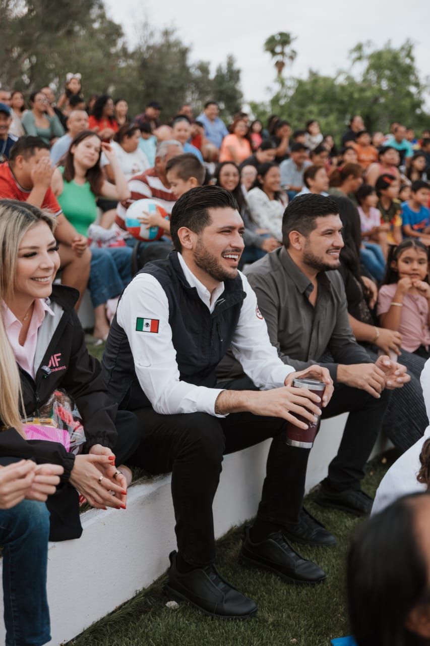 H. Matamoros, Tamaulipas.- Ante la presencia de cientos de niñas, niños y sus familias, el alcalde Beto Granados, junto a la presidenta del DIF Matamoros, Ana Ariceaga de Granados, disfrutaron de una amena noche de cine al aire libre en el parque “Niños Héroes” (El Laguito).