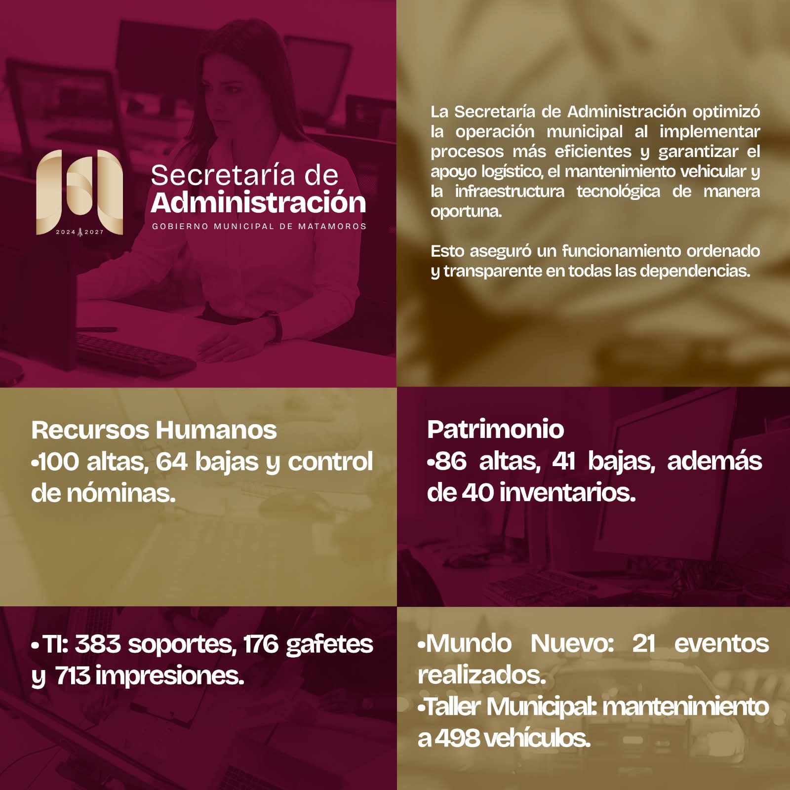 Durante este periodo, la Secretaría de Administración impulsó labores de planeación, transparencia y logística administrativa, lo que permitió mejorar la coordinación entre dependencias y optimizar los procesos internos, reafirmando que Matamoros avanza con orden y responsabilidad.