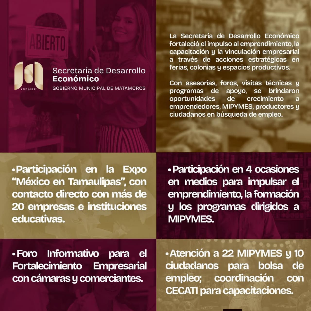 H. Matamoros, Tamaulipas.- Bajo el liderazgo del alcalde de Matamoros, Beto Granados, la Secretaría de Desarrollo Económico fortaleció el emprendimiento, la capacitación y la vinculación empresarial mediante acciones estratégicas desarrolladas en ferias, colonias y diversos espacios productivos del municipio.