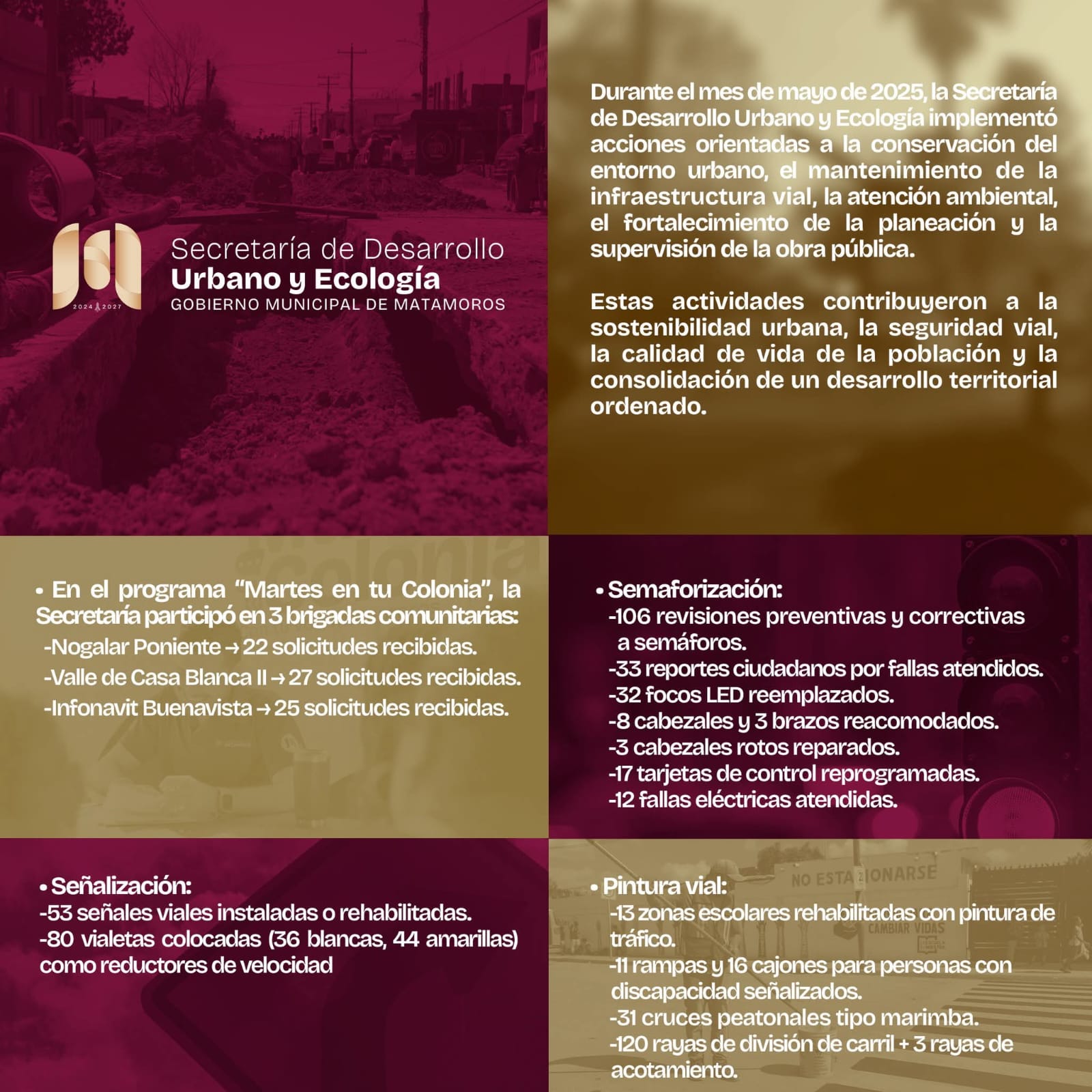 H. Matamoros, Tamaulipas.- Durante el mes de mayo, el gobierno municipal, a través de la Secretaría de Desarrollo Urbano y Ecología, reforzó su compromiso con la ciudadanía trabajando directamente en las calles y colonias del municipio. Estas acciones se enfocaron en mejorar la movilidad, incrementar la seguridad vial y promover el respeto por el entorno urbano, con el objetivo de elevar la calidad de vida de las y los habitantes.
