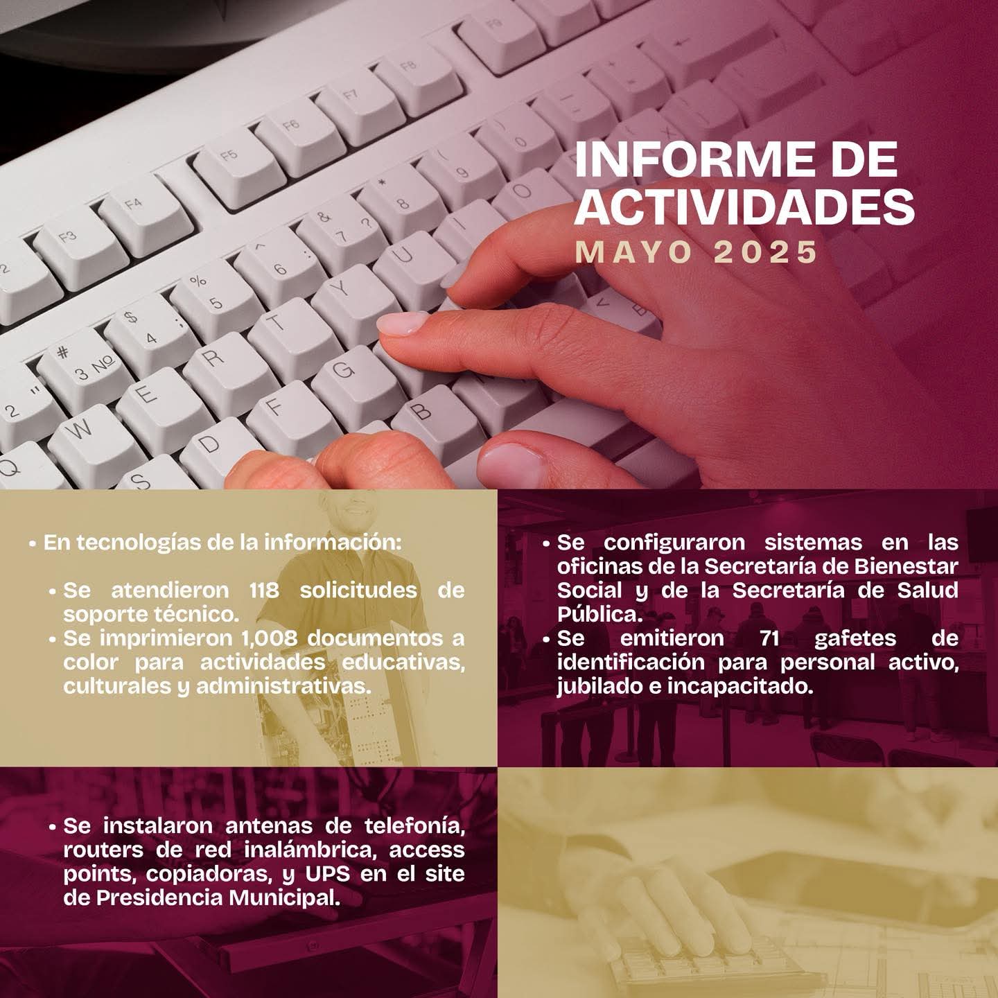 En el ámbito tecnológico, la administración municipal respondió a múltiples solicitudes de soporte técnico, además de instalar equipos que mejoran la conectividad y el desempeño administrativo, lo que se traduce en una atención más eficiente hacia la ciudadanía.
