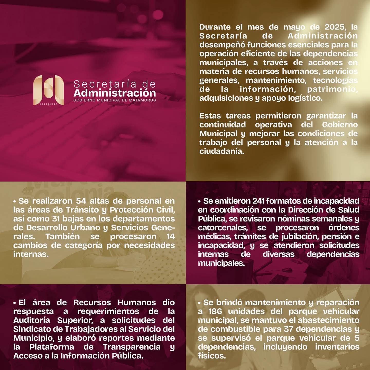 H. Matamoros, Tamaulipas.- Durante el mes de mayo, el Gobierno Municipal de Matamoros, a través de la Secretaría de Administración, llevó a cabo diversas acciones estratégicas enfocadas en mejorar el funcionamiento interno de la administración pública. Estas labores se alinean con el compromiso de construir un municipio más eficiente, bajo los principios de la «Cuarta Transformación», el «Renacimiento de Matamoros» y con la visión de que «Matamoros Avanza».