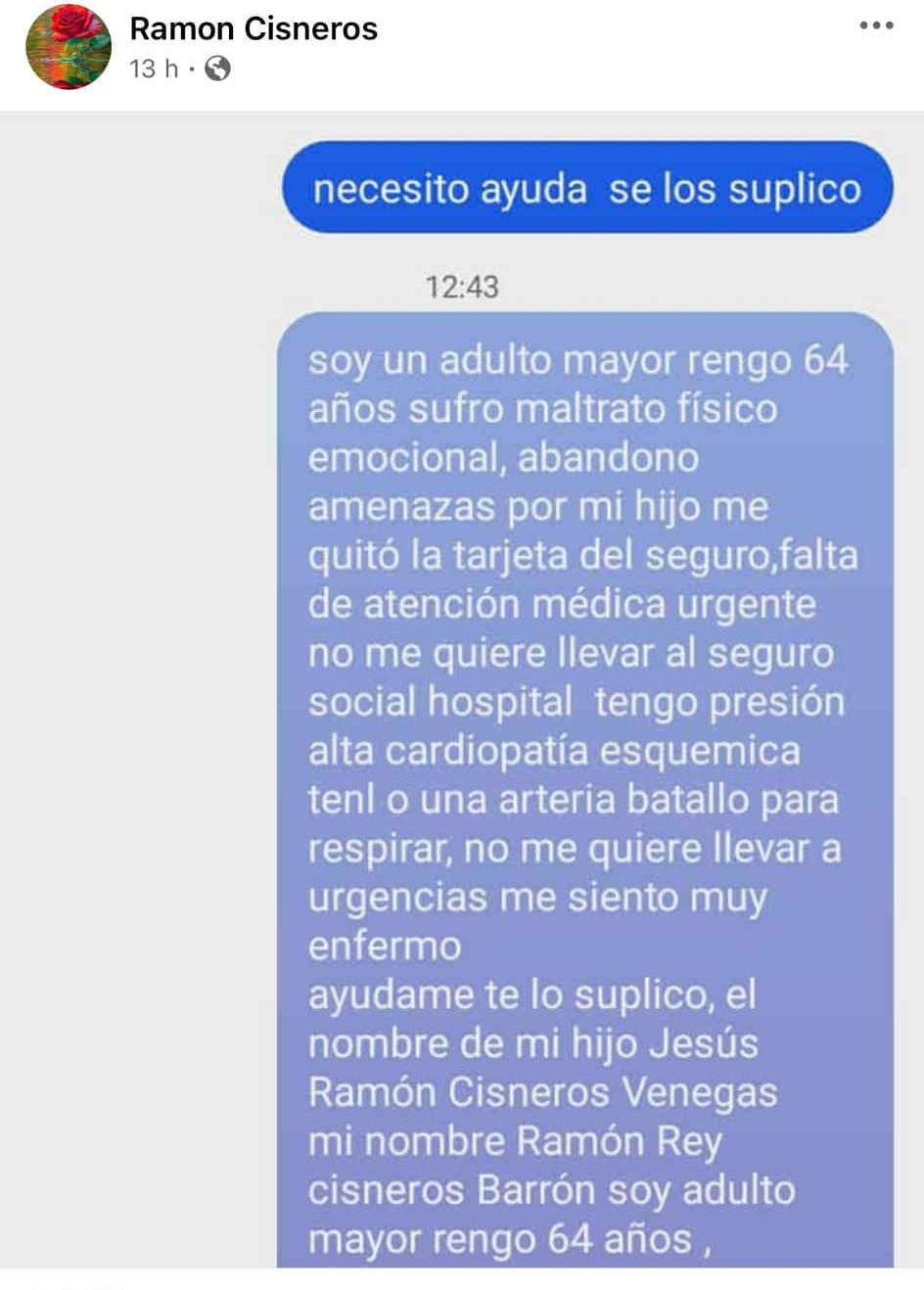 Trascendió que esa misma noche, Ramón Cisneros envió un mensaje a la página de Ambulancias Orduña solicitando auxilio, donde relataba que sufría maltrato físico y emocional, además de ser una persona con discapacidad. En dicho mensaje, señaló directamente a su hijo, Jesús Ramón Cisneros, a quien acusó de maltratarlo, de quitarle su tarjeta del seguro y de negarse a llevarlo a recibir atención médica, pese a su delicado estado de salud.