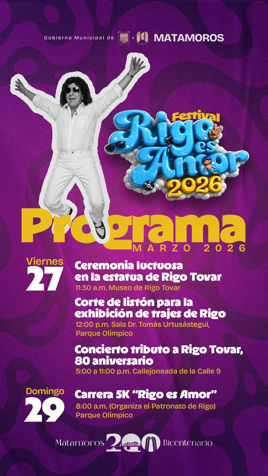 El Gobierno Municipal de Matamoros invita a toda la ciudadanía a participar en el Festival “Rigo es Amor”, un importante reconocimiento al ídolo de las multitudes, Rigo Tovar.