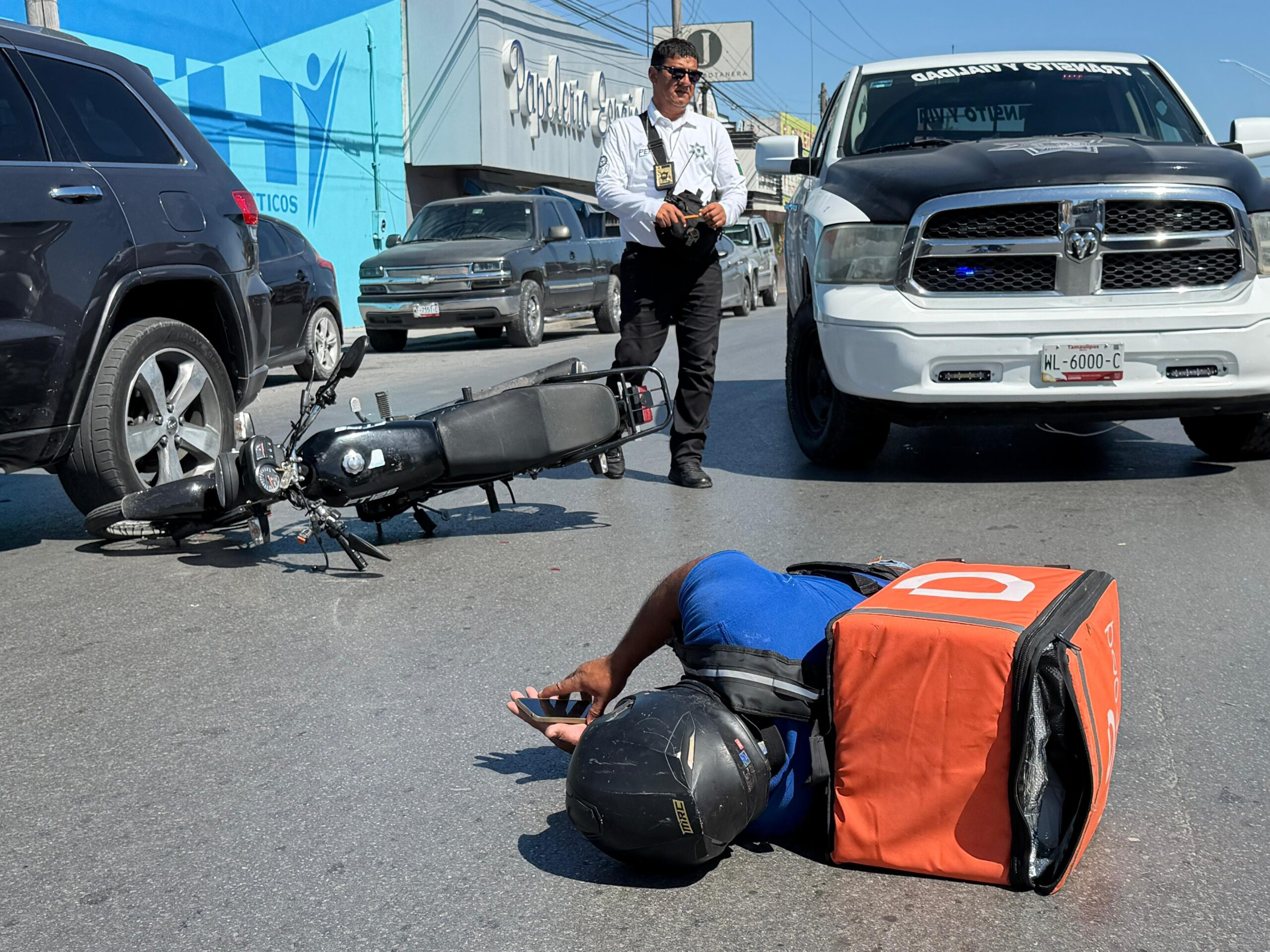 Un motociclista repartidor de la plataforma DiDi resultó lesionado tras verse involucrado en un accidente vial registrado en el cruce de las calles Sexta y Juventino Rosas.