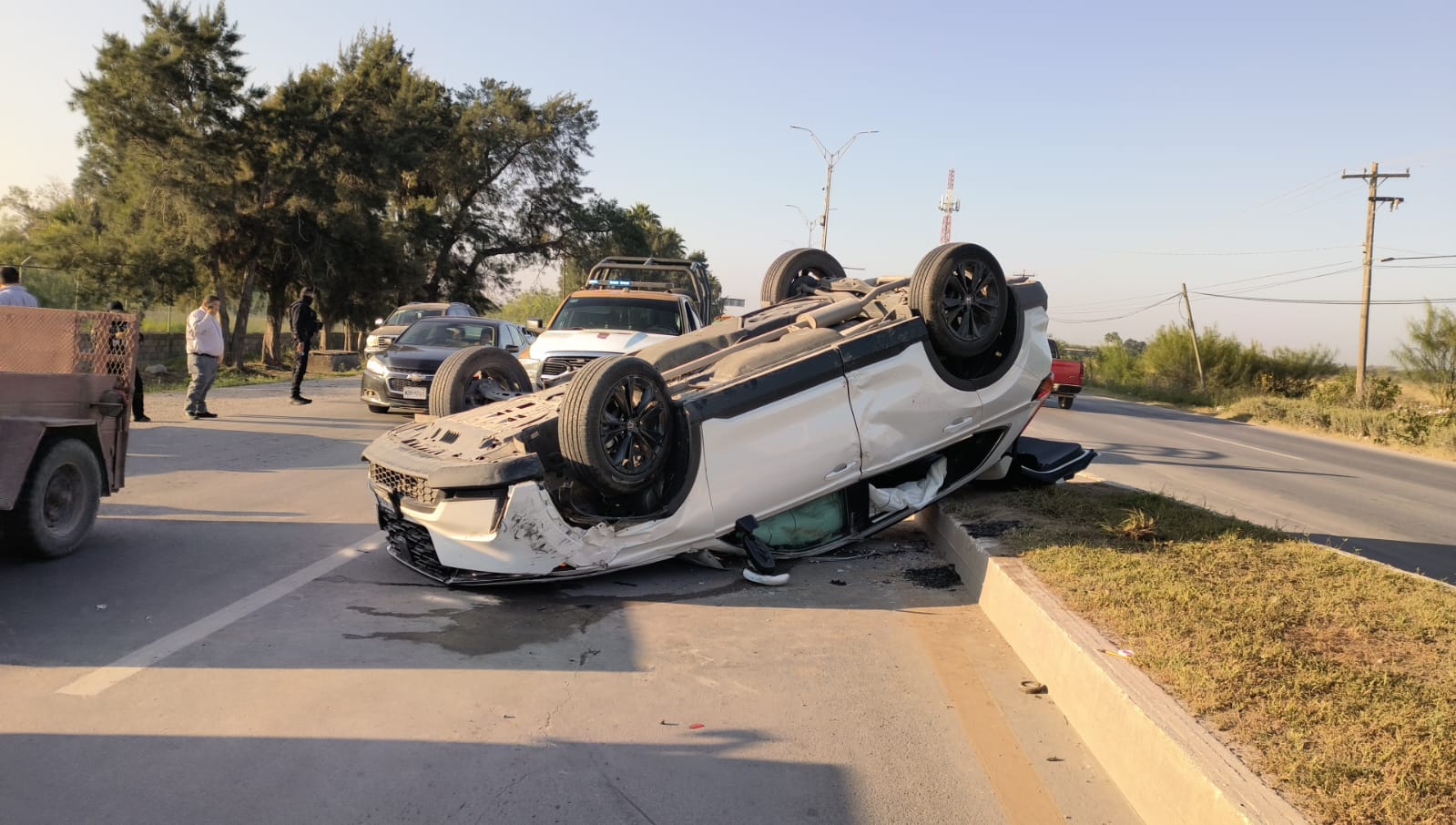 Mujer que presuntamente se iba maquillando al volante provoca aparatosa volcadura frente al aeropuerto de Matamoros