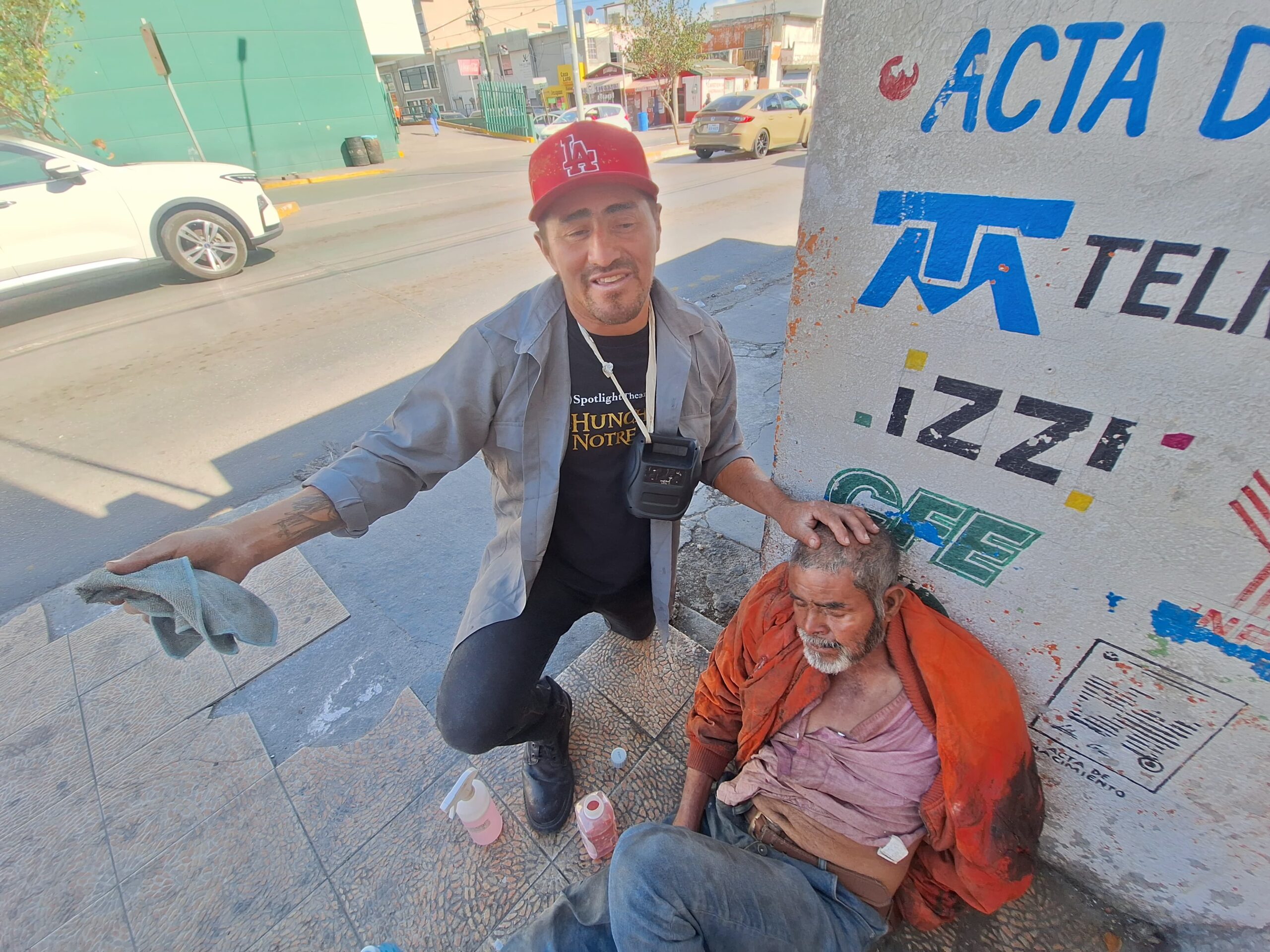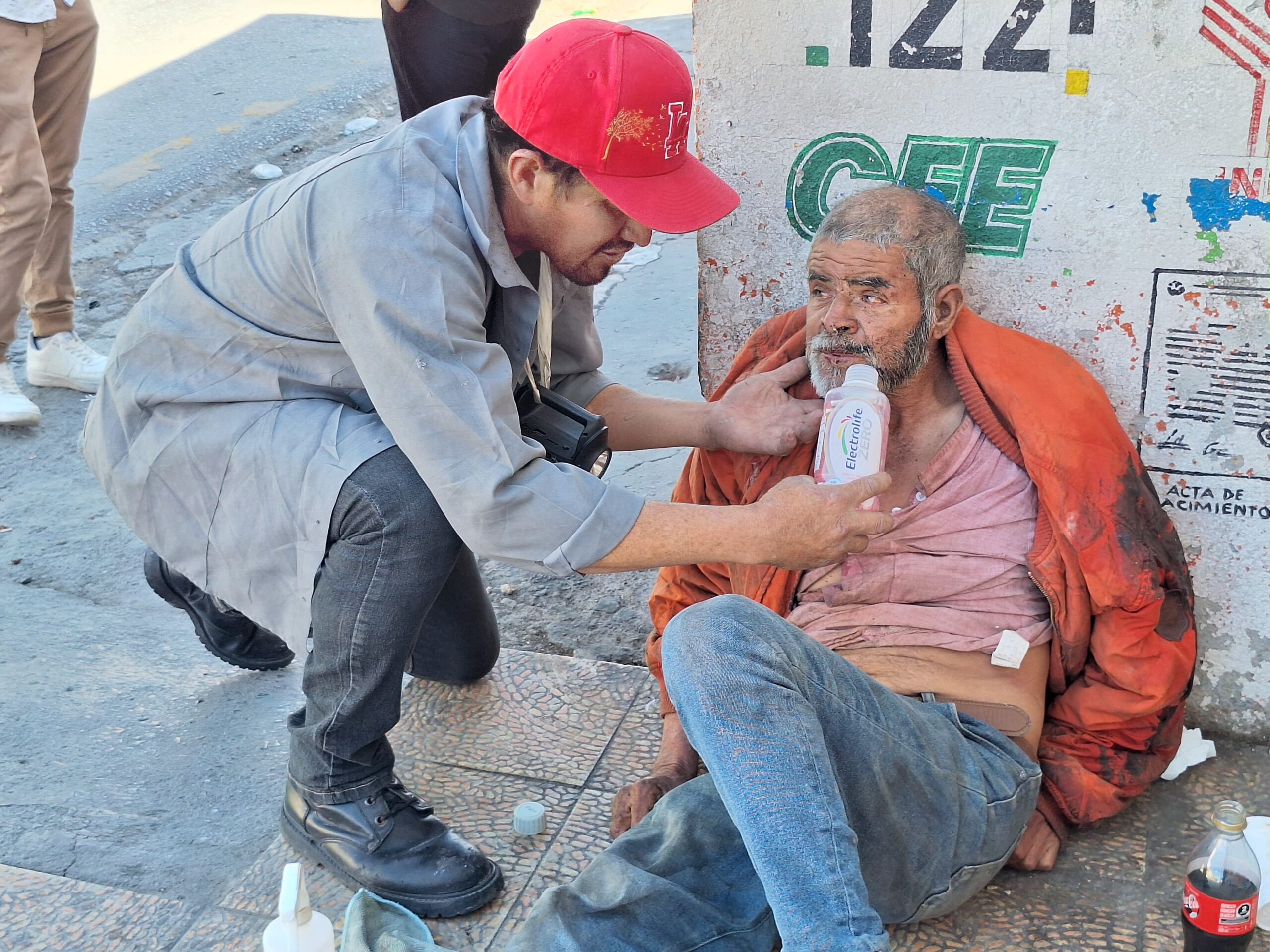 Ante la situación, un hombre que dijo ser paramédico le compró un suero y le realizó curaciones en el rostro. El adulto mayor, identificado como don José, presentaba signos de posible cirrosis y vómito con sangre.
