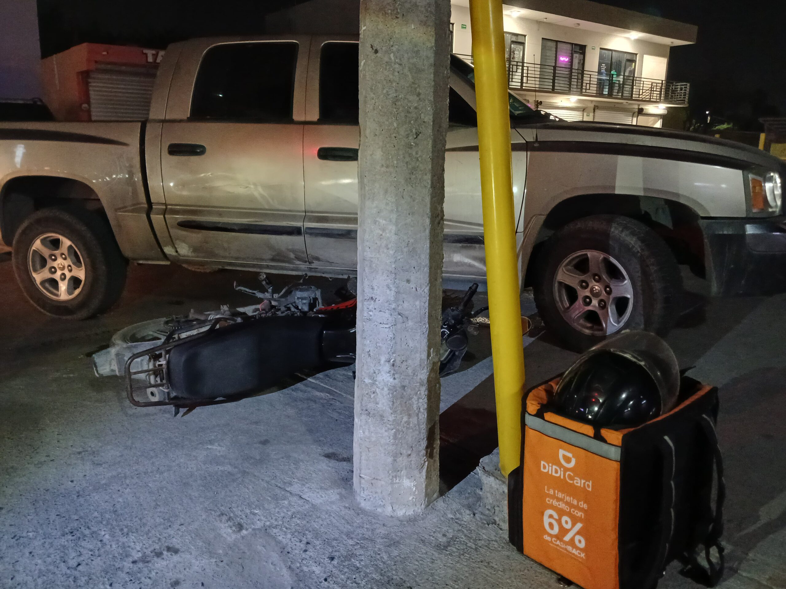 Un choque desigual se registró sobre la avenida Capitán González, a la entrada de la colonia Sección 16, donde se vieron involucrados un motociclista repartidor de la plataforma DiDi y el conductor de una camioneta Dodge Dakota.