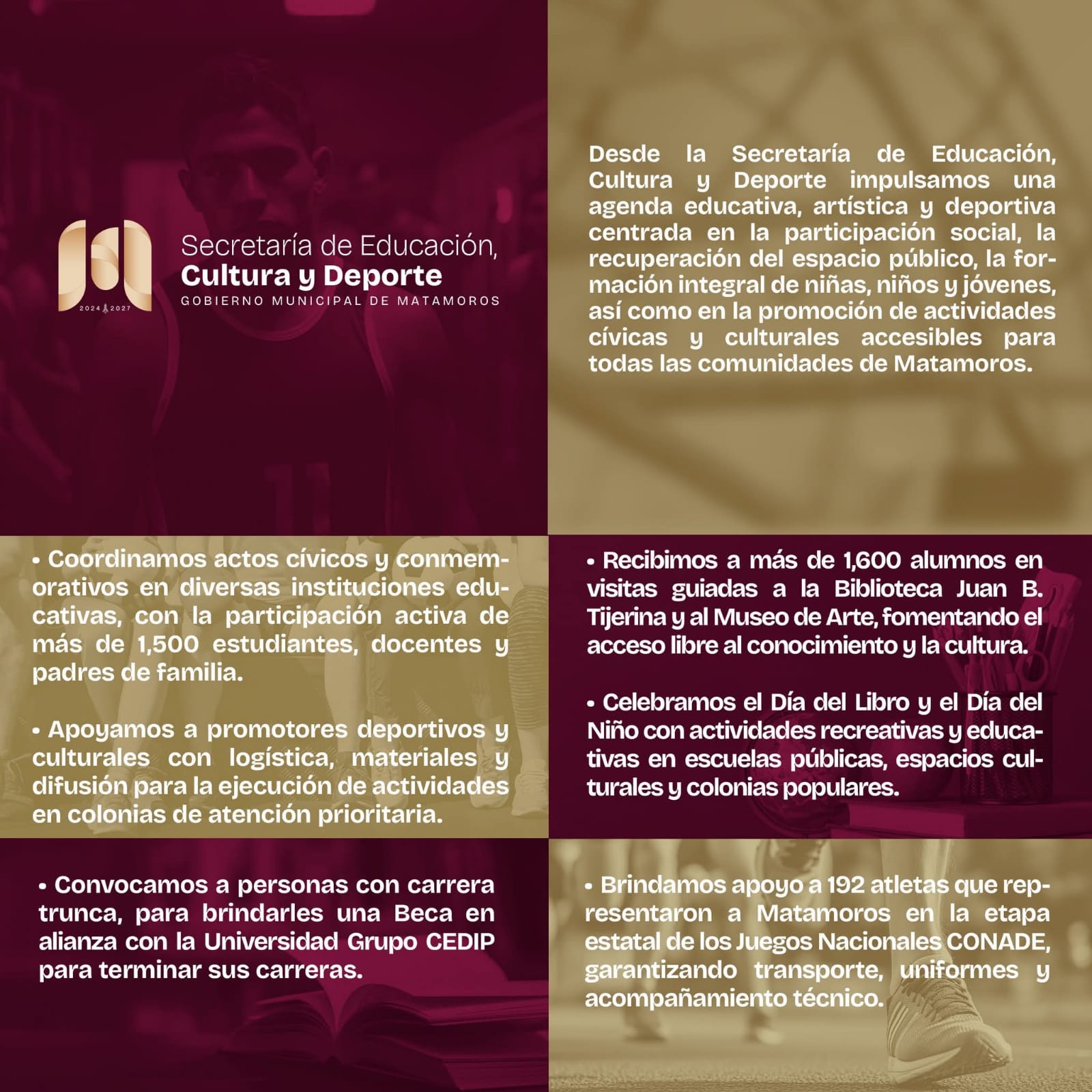 A través de estas acciones, el Gobierno de Matamoros busca fomentar una sociedad más culta, creativa y activa, donde todos tengan acceso a oportunidades y servicios de calidad. La Secretaría de Educación, Cultura y Deporte seguirá trabajando para promover el bienestar y el desarrollo de la comunidad.