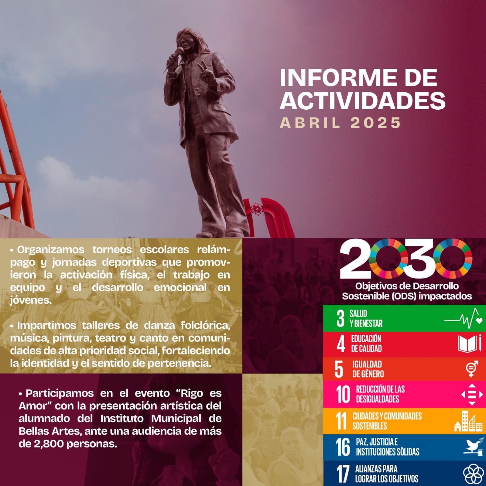 Las actividades realizadas incluyeron actos cívicos, talleres comunitarios, apoyo a atletas y visitas escolares, entre otras. También se celebraron fechas importantes como el Día del Libro y el Día del Niño, lo que permitió a los ciudadanos participar en eventos culturales y recreativos.