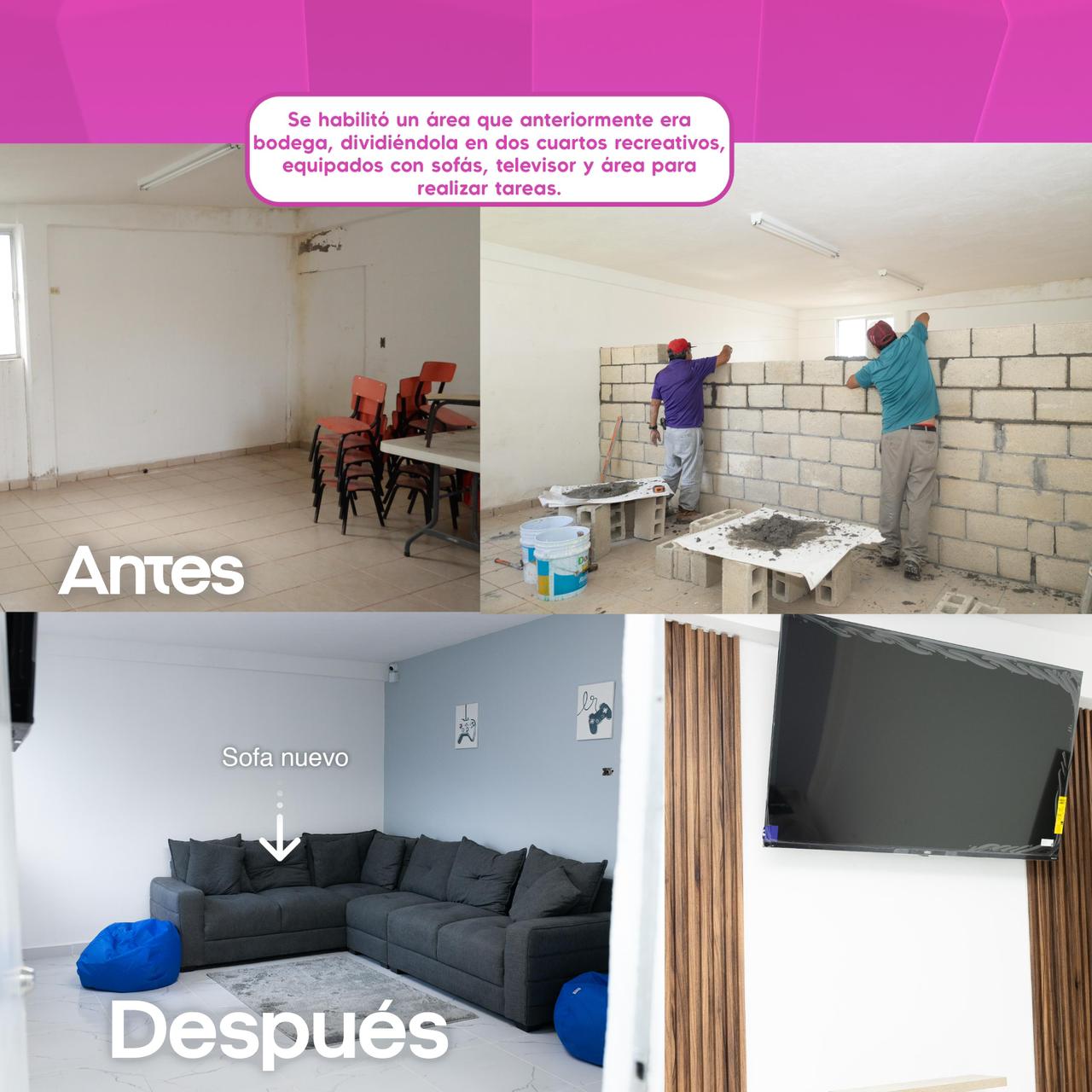 Recreación: Se habilitó una moderna sala audiovisual equipada con televisión y mobiliario necesario para que los menores disfruten de cine y momentos de esparcimiento.