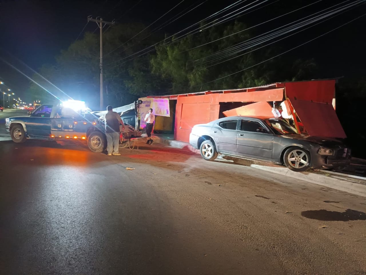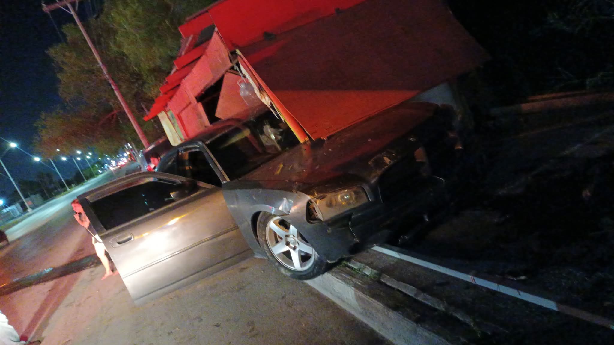 El vehículo brincó el camellón central, avanzó en sentido contrario y se estrelló contra una estructura de madera utilizada como negocio.