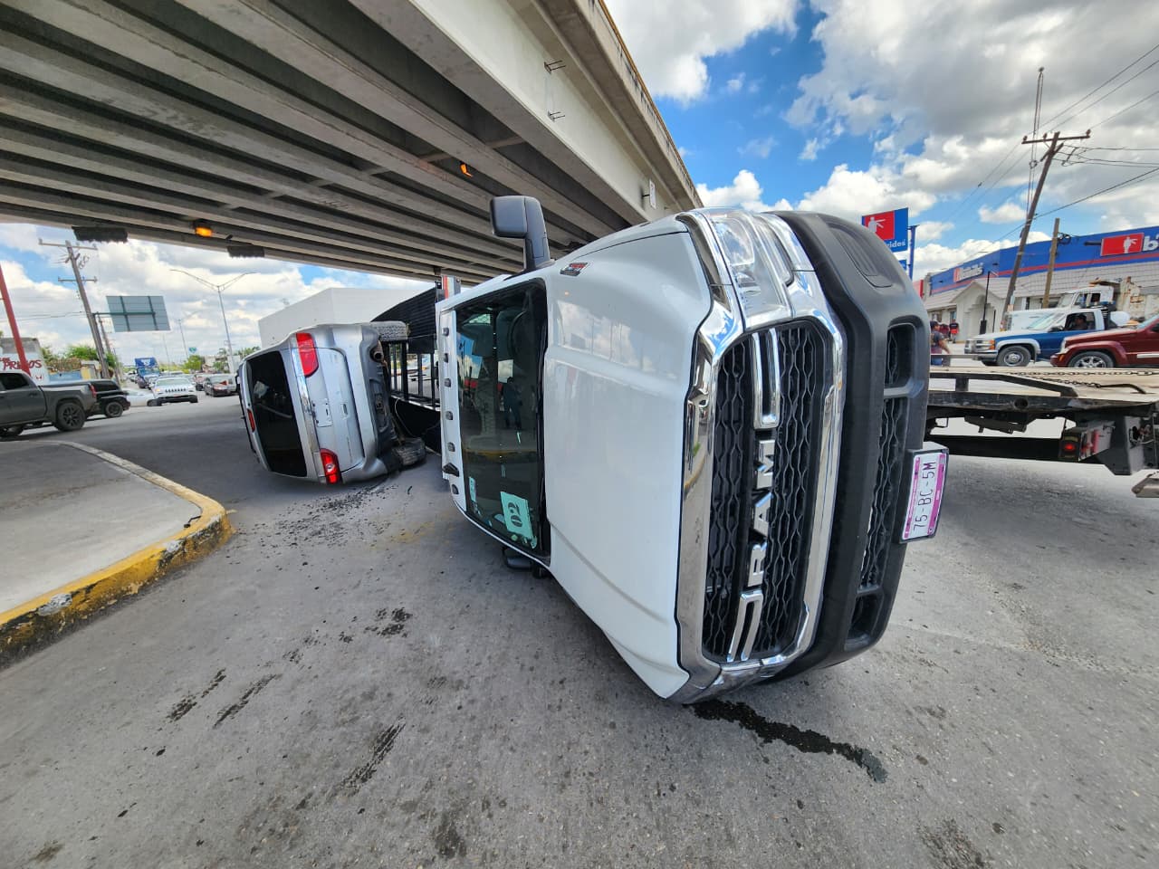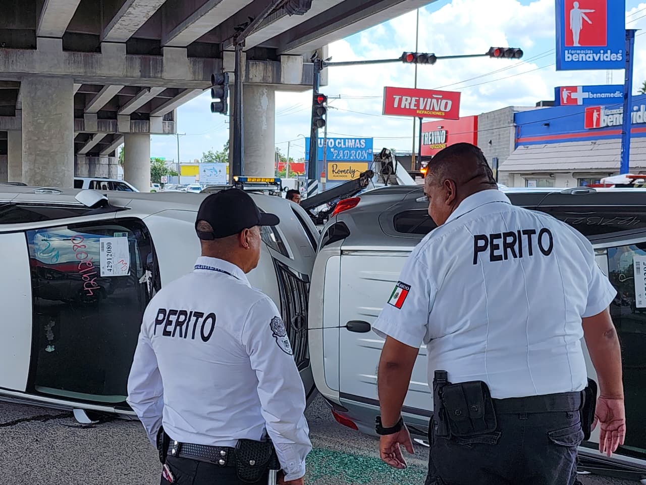 Un vehículo nodriza que transportaba tres automóviles volcó la mañana de este jueves sobre el bulevar Manuel Cavazos Lerma, en la intersección con la avenida del Niño.